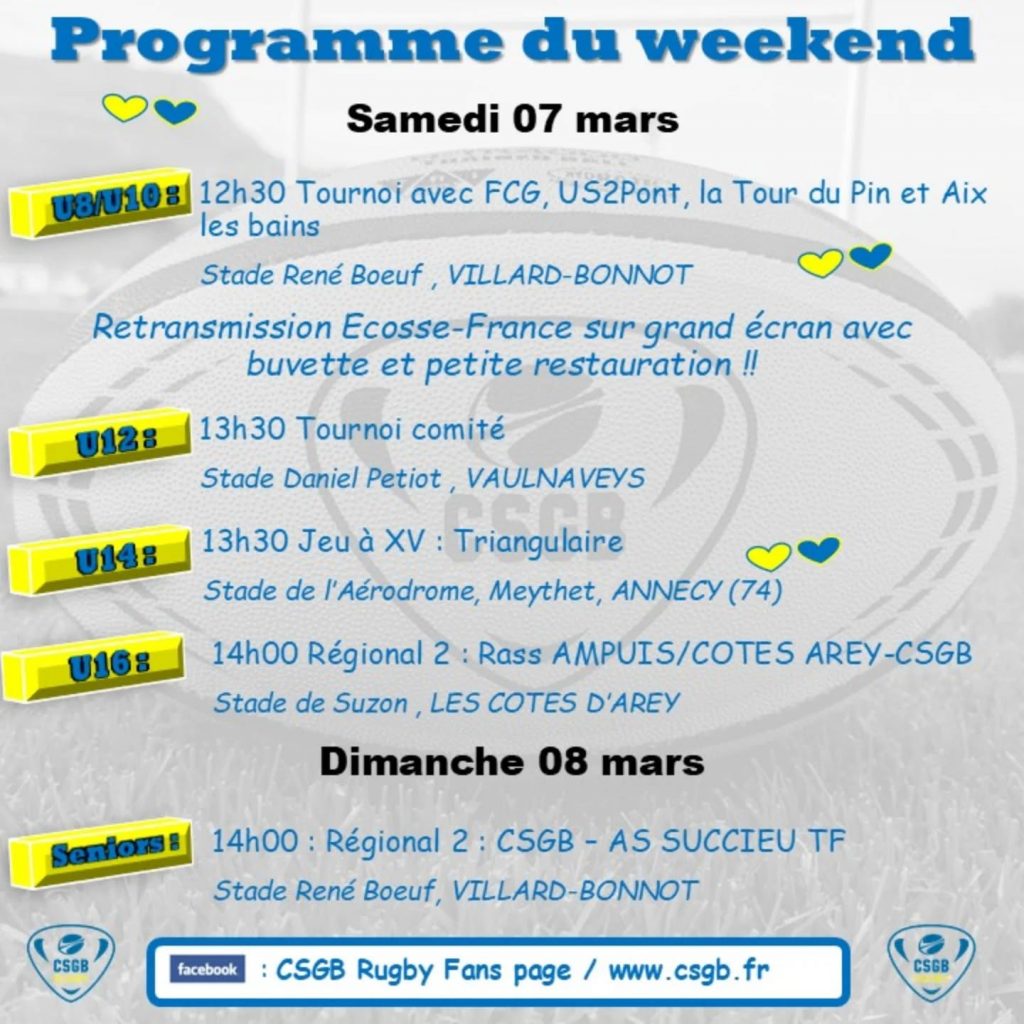 – 7 et 8 Mars 2026 Share Tweet Pin Voici le programme des équipes du CSGB pour ce weekend ! Bon matchs à tous